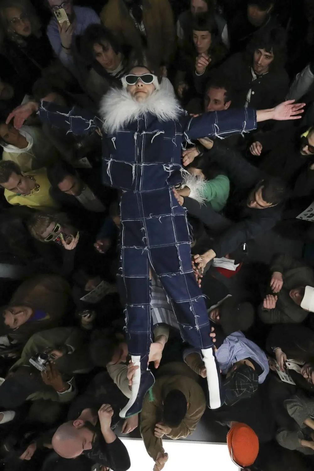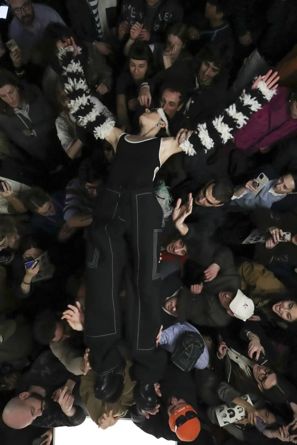 观众像沙丁鱼一样站在 T 台下,由品牌的团队成员组成的模特阵容穿着 2023 秋冬新衣,像摇滚歌手一样从 T 台纵身一跃, “跳水” 进入兴奋狂热的观众席。设计师说,这是一场关乎自由、信任、信心、冒险、互动、参与的秀,是为整个团队准备的一场狂欢。