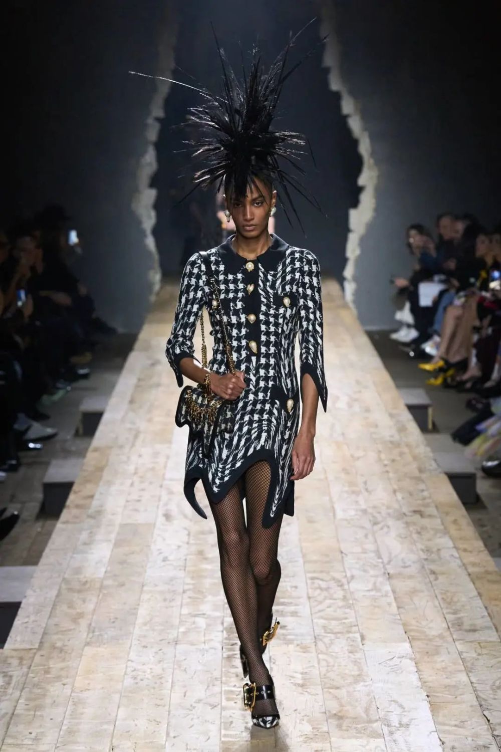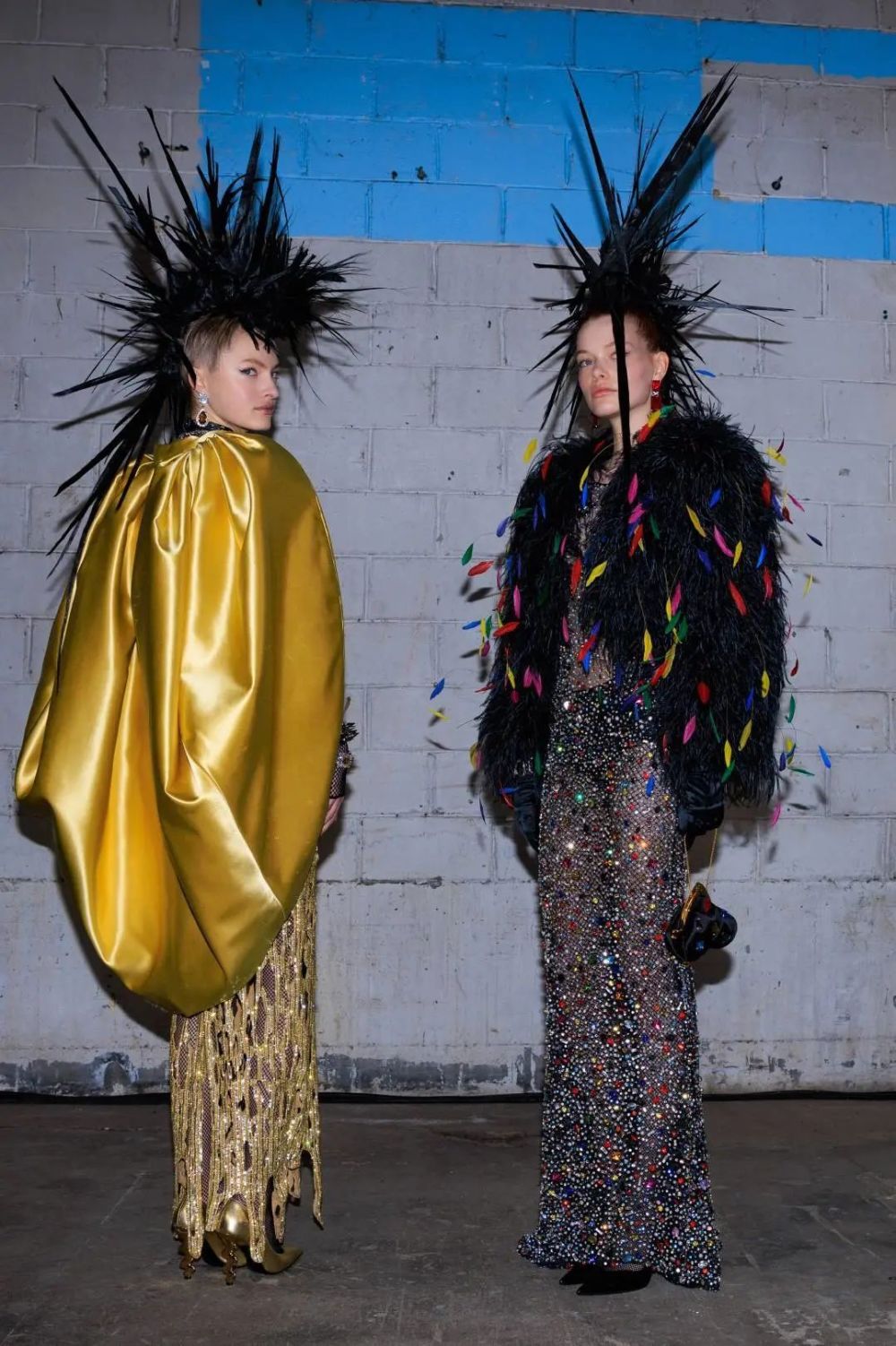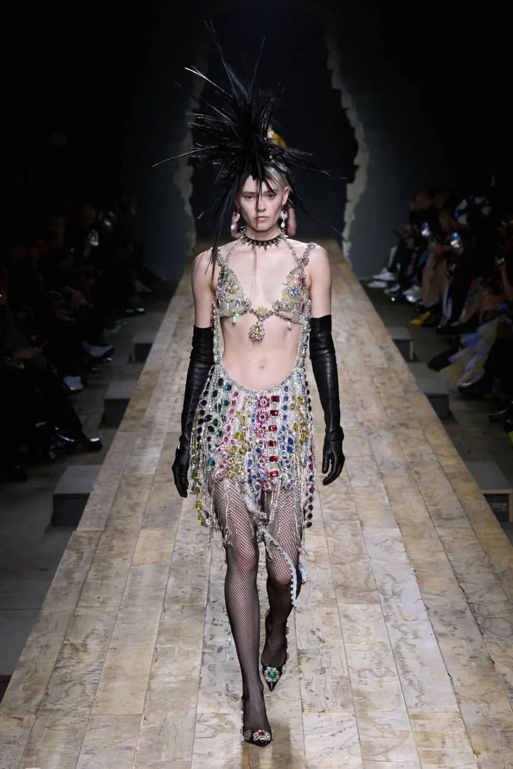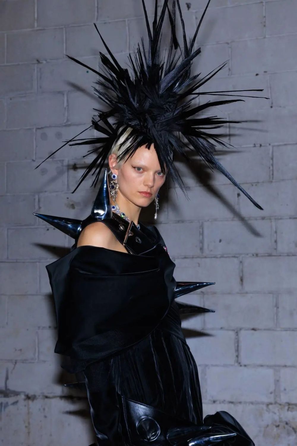 廓形尖刺设计,模特头戴的莫西干头饰,满布的珠宝配饰,夸张变形的裙摆——这一季是关于 “扭曲” 的时尚戏剧。这是从 Dali 的著名画作 《记忆的永恒》 中得到的灵感。