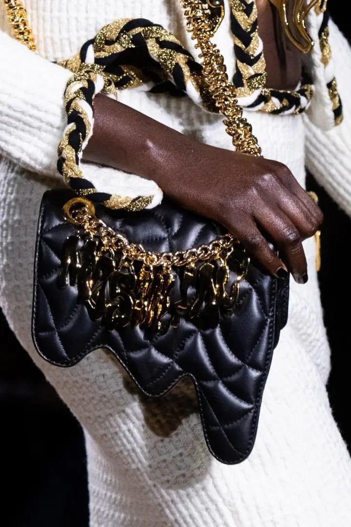 Moschino 的标志性产品都在全新设计之下被熔化和修改重组——千鸟格外套与短裙的衣摆是如水滴般的液态形状,手袋也做成不规则流动形态。