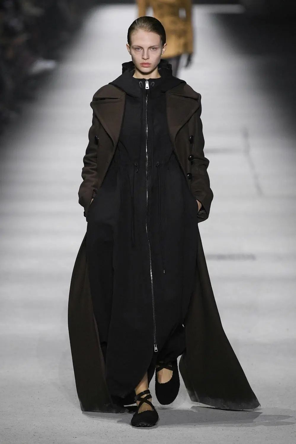 Sciura,他们规规矩矩创造了非常精致的米兰风格。不再是从头黑到脚,他们给出了更多色板,紫色、黑色、米色和波尔多色,都是优雅的代表。更多的高领针织、精致剪裁的西装和大衣、优雅的鱼尾裙……连灵缇犬印花都有一种老钱味道,宛如古堡里的挂毯。
