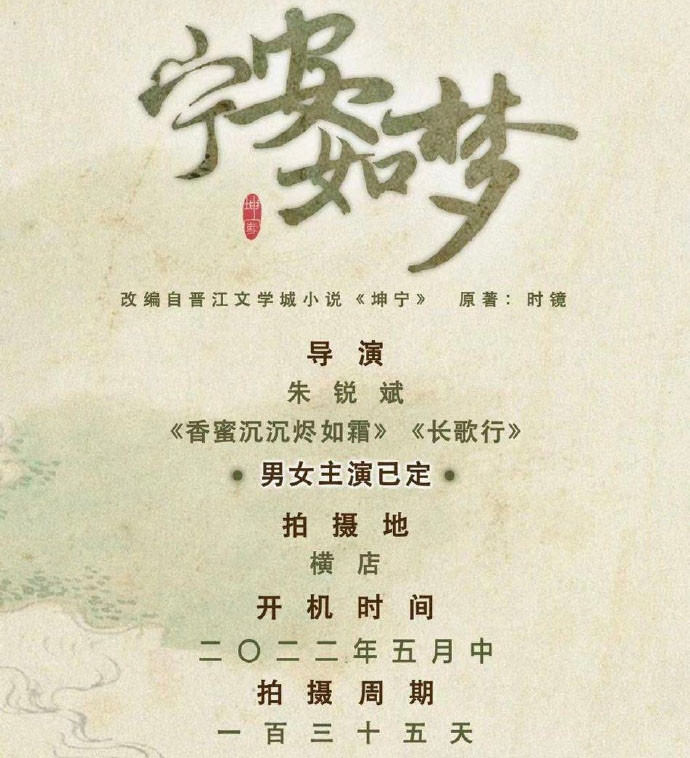 《坤宁》被影视化的消息其实一直以来都有传闻,只是今天被证实了,原本是改编自晋江作者时镜的小说,改名为《宁安如梦》。导演朱锐斌是最近热播的《与君初相识》《香蜜》的导演,虽然有出名代表作,但是运镜手法有点“危险”,针对那些颜值不过关的演员们来说的。