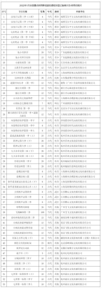 2022年1月,在广电总局“重点网络影视剧信息备案系统”中登记且符合重点网络原创视听节目制作相关规定的片目共246部。其中网络动画片53部887集。其中都市题材6部24集,青少题材6部190集,民族题材1部26集,科幻题材5部56集,传奇题材16部241集,武打题材3部20集,其他题材16部330集。
