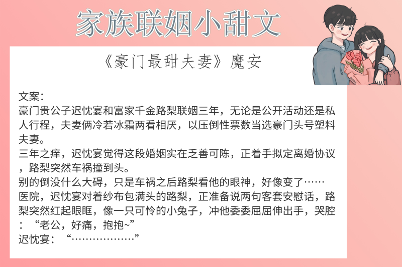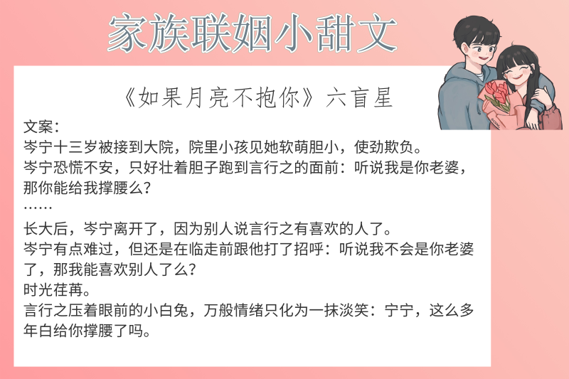 哈喽,大家好,这里是陌离小说!今天给大家带来的是6本家族联姻小甜文!喜欢甜文的小伙伴们赶紧看过来!其中六盲星的《如果月亮不抱你》不错!赶紧马住吧!