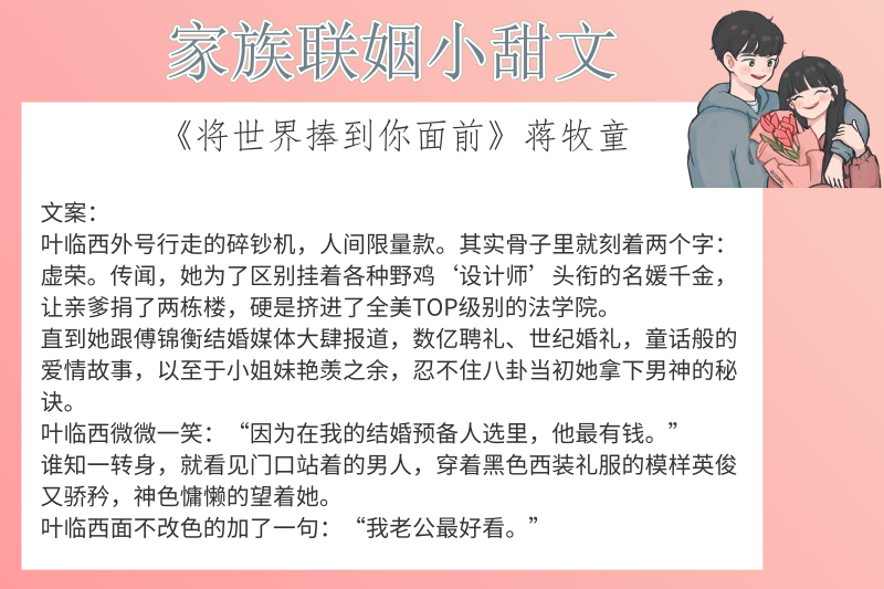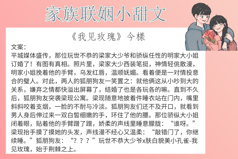 点评:玩世不恭大少爷男主X肤白貌美小孔雀女主 现代HE635K 男女主青梅竹马,户不对盘,长大后却要联姻。一开始男主并不同意,但是得知女主其他几个备选的联姻对象太人渣就答应了联姻。两人领了证后,不知情的朋友还一心想要他们和好,实际两人因联姻多了相处多了了解已经勾搭在一块儿了!