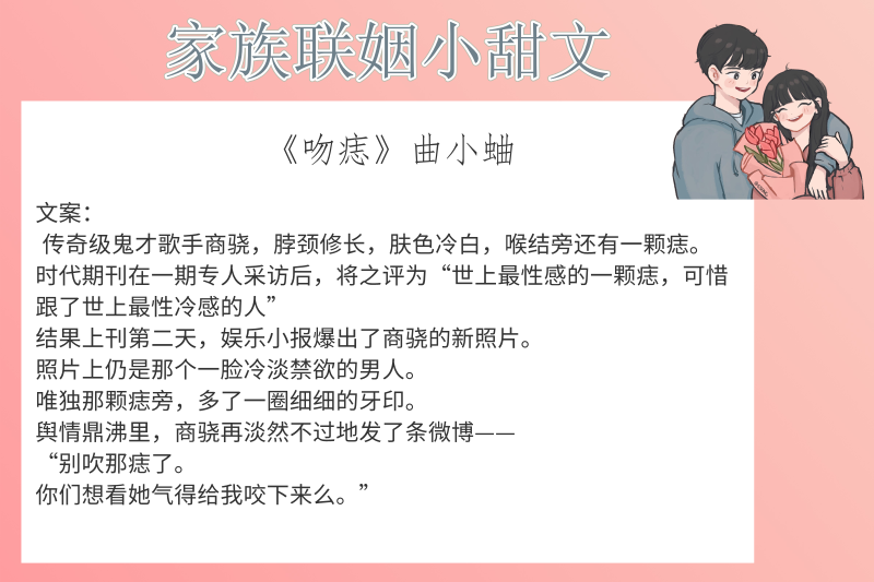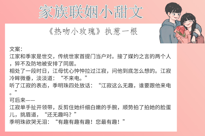 点评:这本书让我明白了“只要是瓜,就算强扭的也甜”。江家和季家本身是世家,门当户对,男女主早就是父母之命,媒妁之言,本来双方长辈看他俩实在不来电,准备登门退婚,然而就在推开门的电光火石之间,心动的感觉说来就来了。在欢乐的同居生活中,两人互生情愫,最后携手未来,相伴终生。