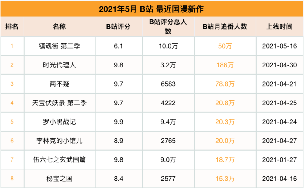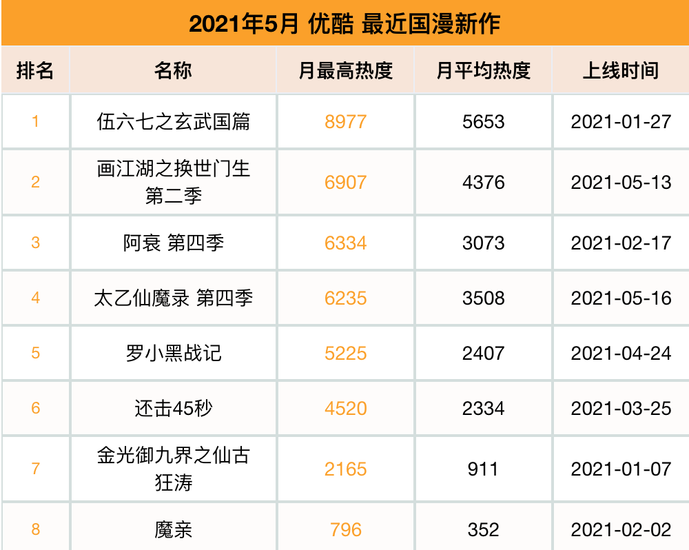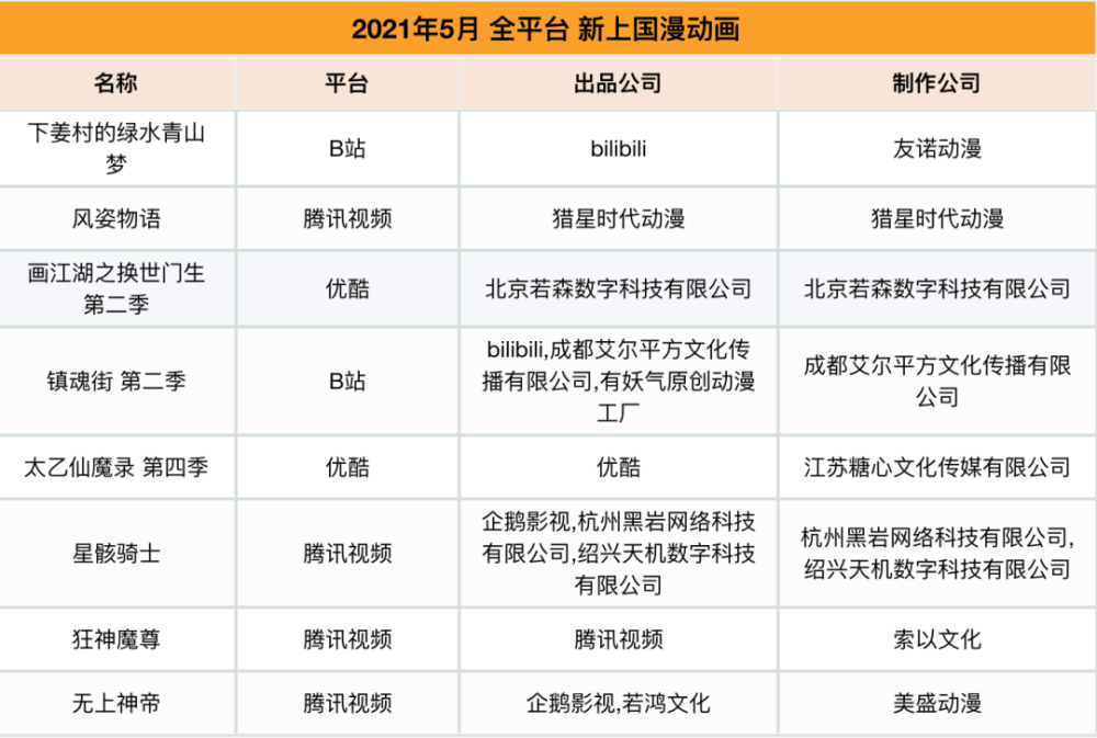 2021年5月,共有7部国漫动画新作上线,其中包括续更作品:《星骸骑士》《无上神帝》,还有重制作品《镇魂街 第二季》。