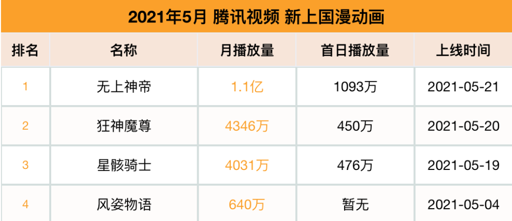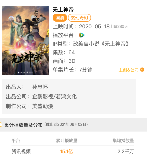 5月18日,由腾讯视频和若鸿文化联合出品玄幻动画《无上神帝》续集在腾讯视频独家播出,续集上线首日播放量为1100万,目前《无上神帝》全集的累计播放量已经超过15亿。