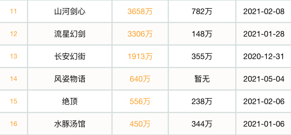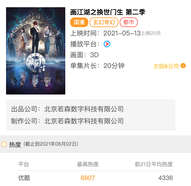 由若森数字出品的《画江湖之换世门生2》于5月13日在优酷独播,优酷最高单日热度达到6900,上线后的21天内的日均热度在4000以上。