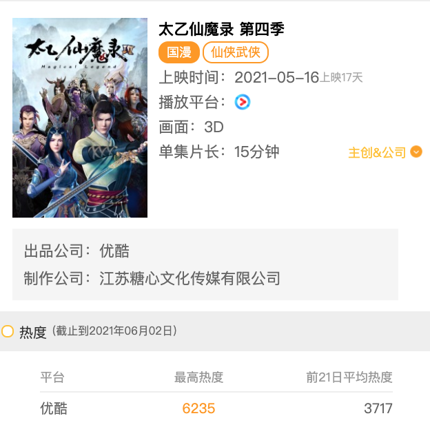 5月16日,由优酷出品的仙侠类动画《太乙仙魔录4》在优酷独播,该作品的优酷单日最高热度达到6200,《太乙仙魔录第1季》早在2016年在多家平台播出。