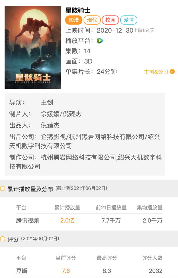 科幻题材动画《星骸骑士》于5月19日续更,目前《星骸骑士》全集的累计播放量超过2亿。