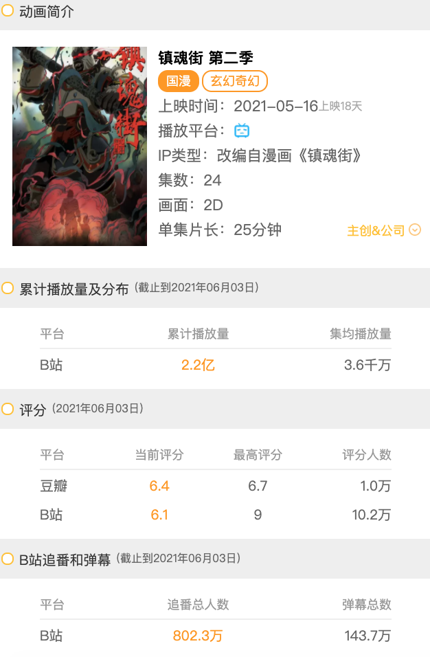 《镇魂街2》重制篇于5月16日在B站独家播出,上线当日,《镇魂街2》的单日播放量就提升到500万,累计播放量超过2亿,追番人数超过800万。