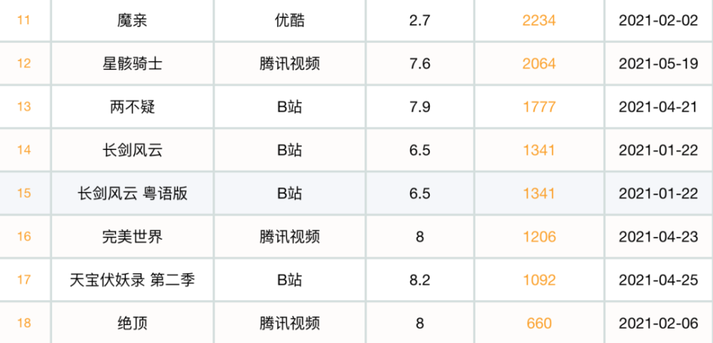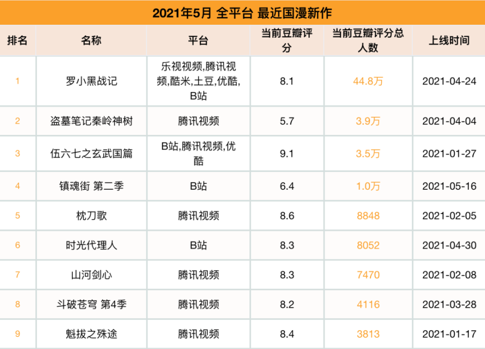 5月份上新的国漫作品中(续更和重制作品除外),有2部作品改编于小说,具体如下表所示: