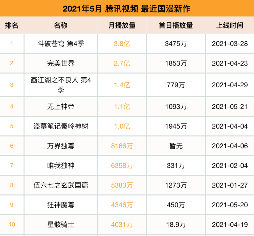 本月腾讯视频榜单排名方面,《斗破苍穹4》的单月播放量3.8亿,排名较上月升到第一位;4月底上线的《完美世界》单月播放量2.7亿排名升至第二;续更作品《无上神帝》单月播放量过亿,排名升至第三。