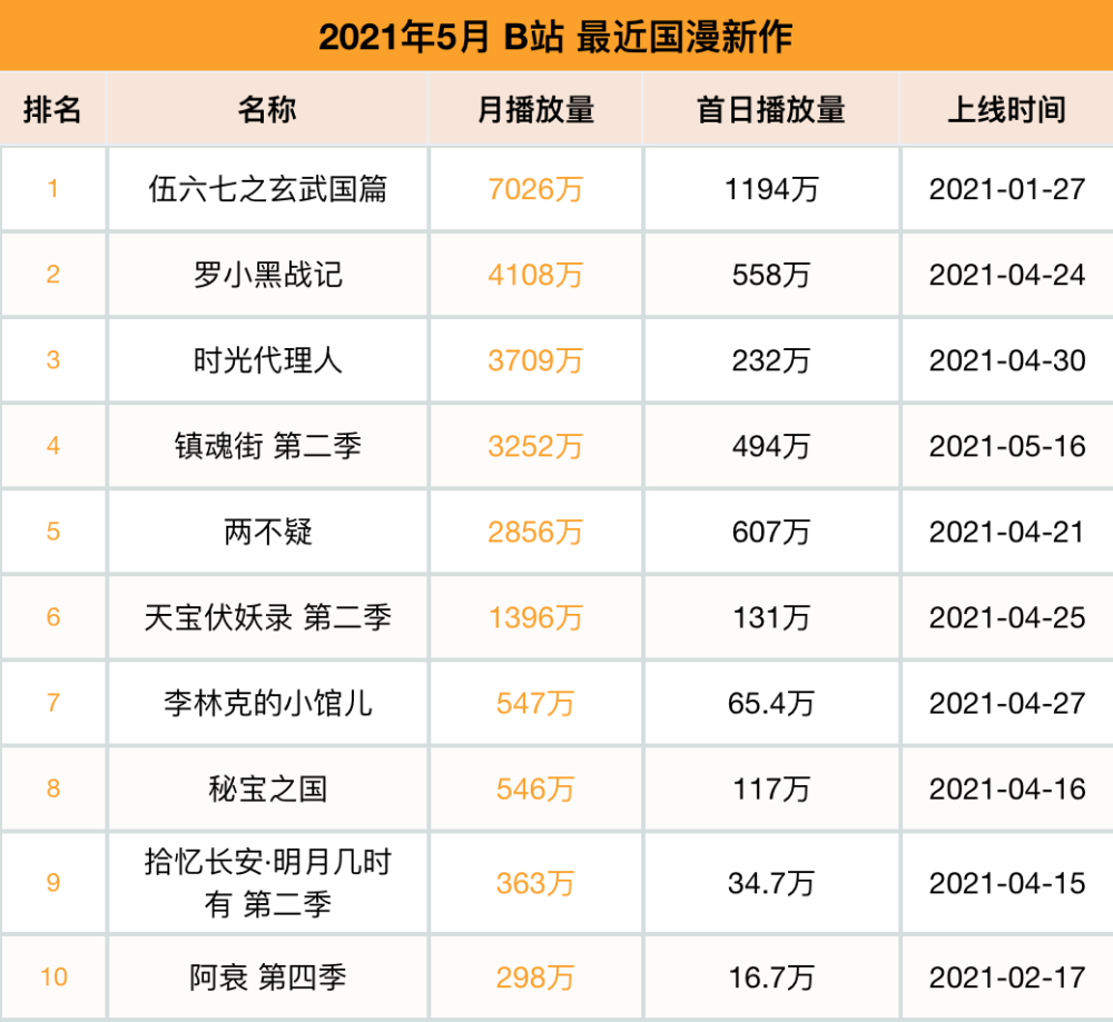 本月B站平台在榜作品中,《伍六七之玄武国篇》仍保持第一,单月播放量在7000万以上。4月底新作《时光代理人》单月播放量超3700万表现优秀。5月上线的《镇魂街2 重制篇》单月播放量达到3200万。