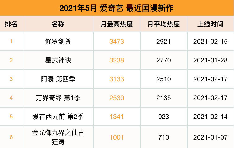 爱奇艺平台5月榜单中,《修罗剑尊》《星武神诀》《阿衰第4季》单日最高热度都超过3000。