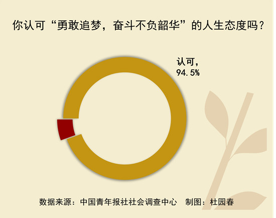 94.5%受访青年认可“勇敢追梦,奋斗不负韶华”的人生态度