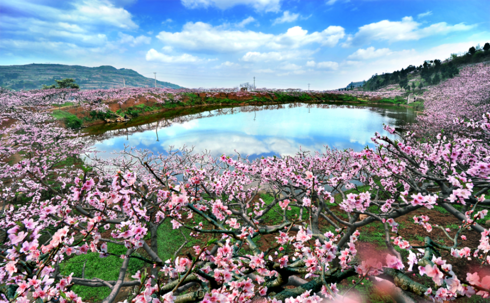 赏花点位:成都龙泉驿、大邑县悦来镇桃花寨、眉山东坡区三苏镇、眉山仁寿文宫镇、德阳广汉连山镇、自贡自流井区尖山、遂宁大英卓筒井镇为干屏村