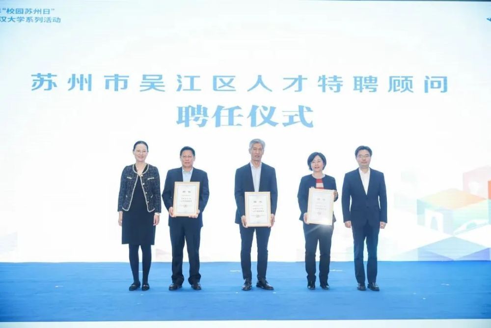 活动上,特别聘请了武汉大学电子信息学院党委书记李德识、化学与分子科学学院党委书记王丽萍、武汉大学苏州研究院院长黄佐斌担任吴江区人才特聘顾问,并聘请5名优秀的在校师生担任“苏创”校园使者,进一步加强地方与高校人才交流合作,拓宽招才引智渠道。