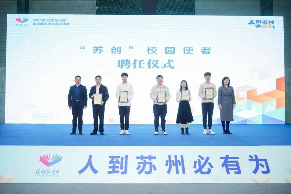 ▲武汉大学校团委书记黄鑫、苏州团市委副书记蒋妍共同为“苏创”校园使者颁发聘书。