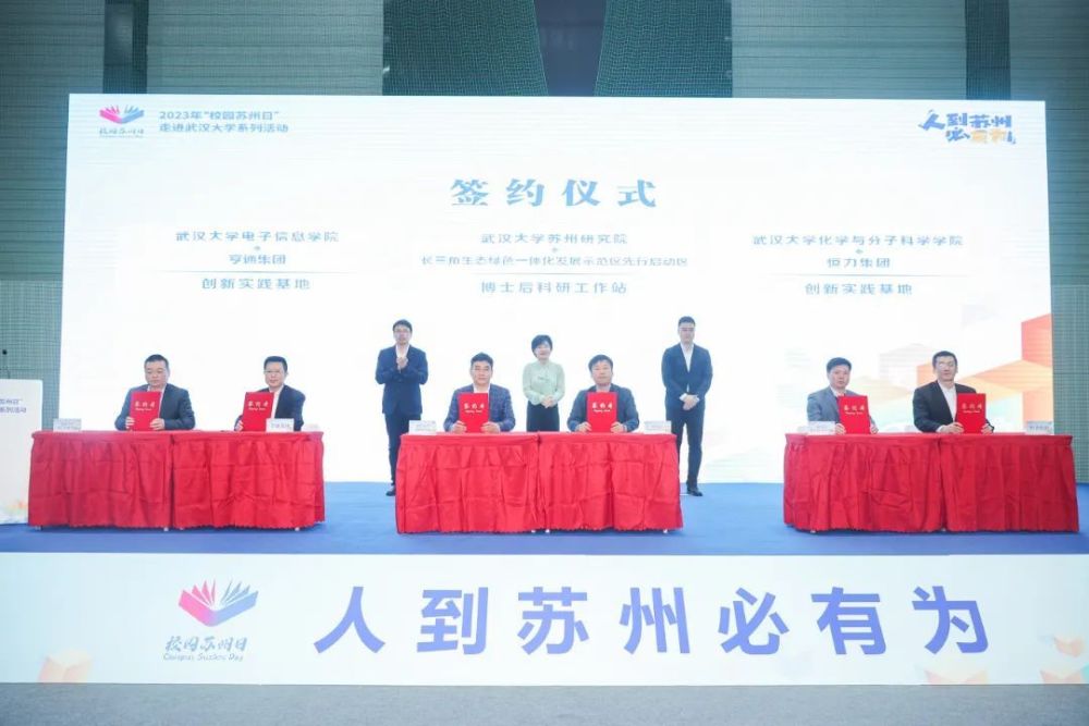 活动现场,汾湖高新区与武汉大学苏州研究院签约打造长三角生态绿色一体化发展示范区先行启动区博士后工作站,恒力集团、亨通集团分别与武汉大学化学与分子科学学院、电子信息学院签约设立创新实践基地。