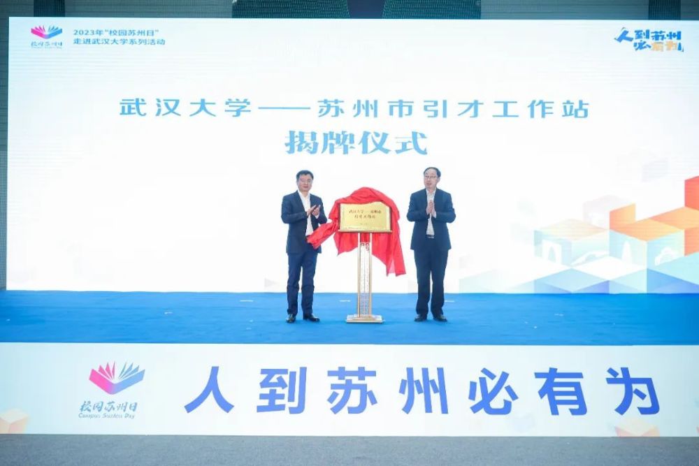 ▲武汉大学学生就业指导和服务中心主任龙滔、苏州市人才服务中心主任李健共同为“武汉大学——苏州市引才工作站”揭牌。