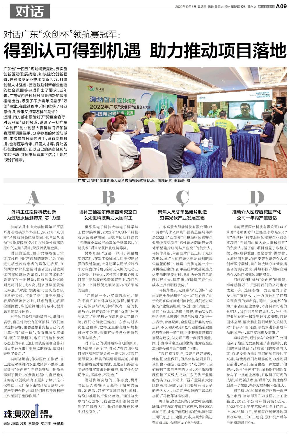 近期,南方都市报策划了“湾区会客厅·对话冠军”系列报道,邀请了一批广东“众创杯”创业创新大赛科技海归领航赛冠军项目选手,分享参赛的体验与感想。本次参与分享的选手,既有高校教授,也有医学专家、归国人才等。身处各行各业的他们,正以自己的亲身经历与实际行动,共同书写着脚下这片土地的“双创”篇章。