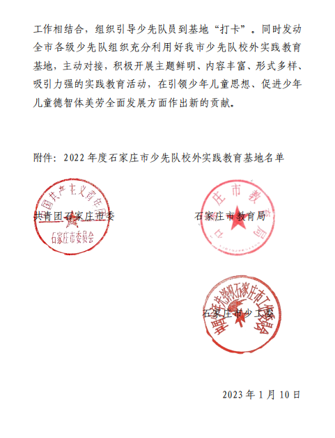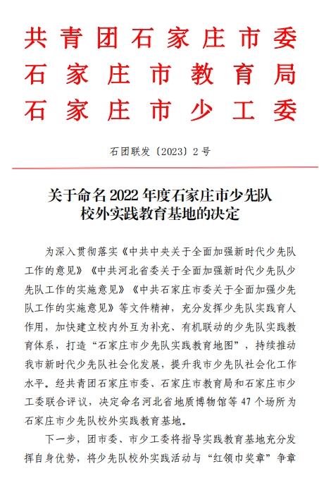 手机访问:wap.265xx.com喜报!我县3个基地成功入选石家庄市少先队校外实践教育基地!