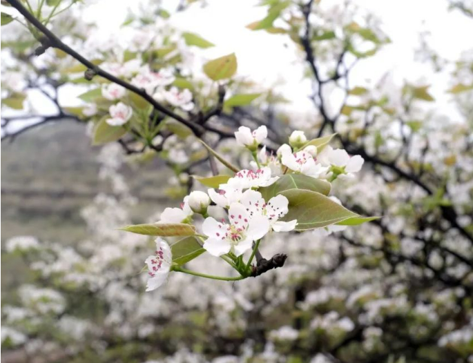 在秀山县溶溪镇的梨园村,雪白的梨花早已开遍山野,白色的花瓣中星星点点的紫红色点缀其间,笑盈盈地在风中摇曳。