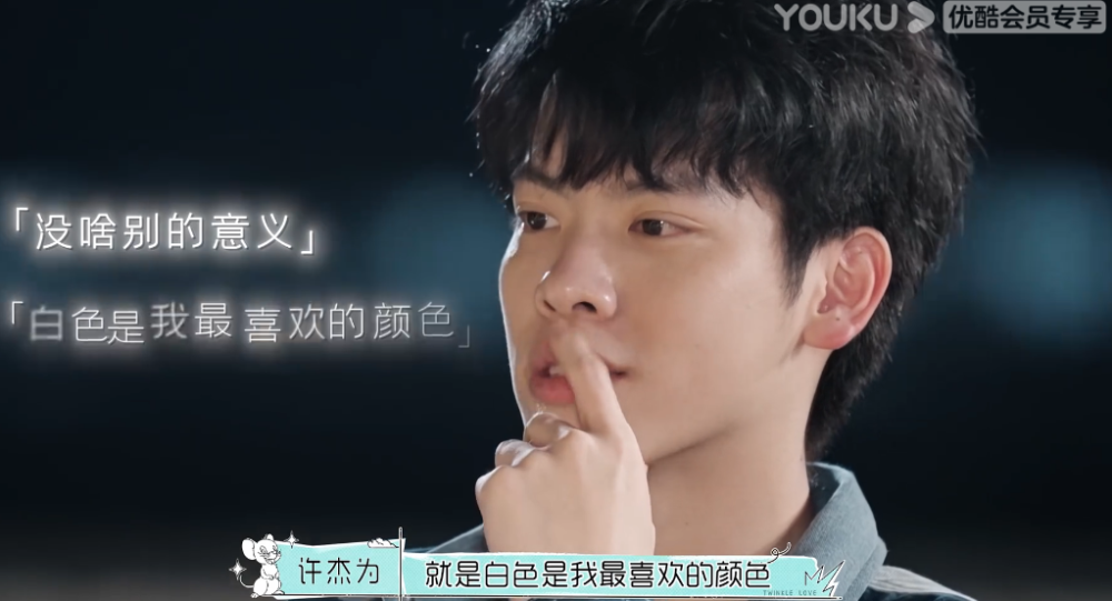 在听留言时刻,朱非儿又开启了对许杰为新一天的问题:如果你用一个颜色来形容今天的心情, 并说明一下选颜色的原因。最终许杰为在这个对他而言很难回答的问题中选了个白色,并说明:没啥别的意义,白色是我最喜欢的颜色。