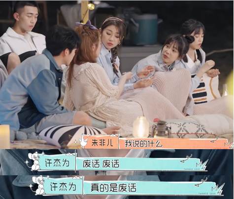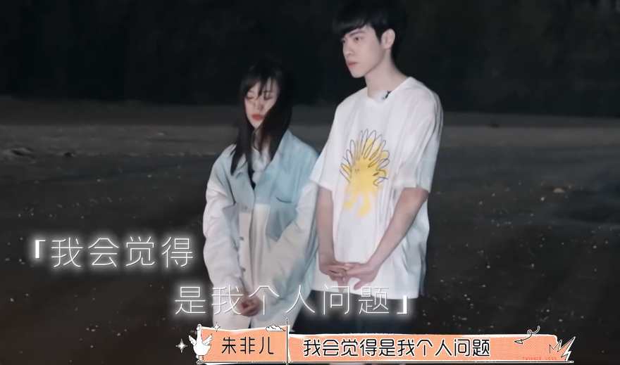 第9期素人嘉宾们来到三亚的沙滩露营,许杰为和朱非儿在沙滩闲逛时,许杰为问到朱非儿:”你觉得我之前和你说的话(交往有压力,不代表对你没有好感……),是不是有点伤人或者听着不舒服“。