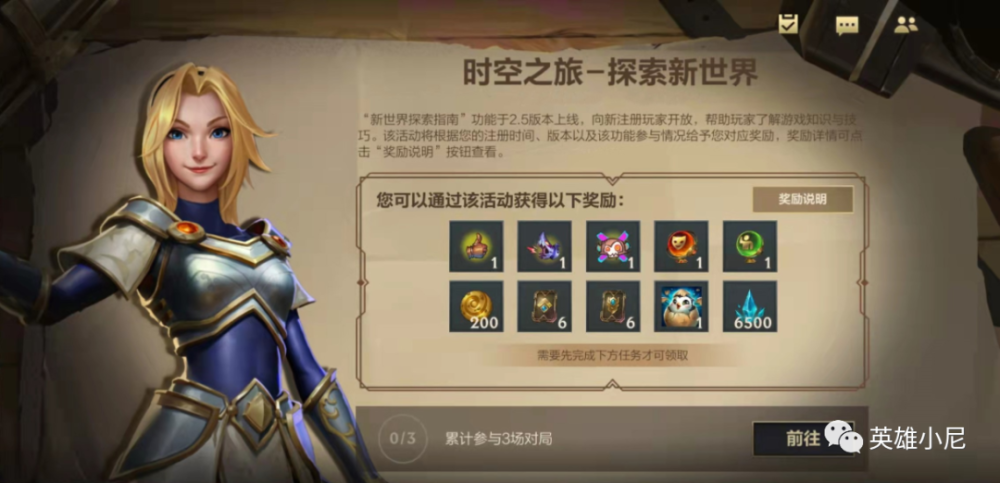 对于“新世界探索指南”功能推出时已不符合功能准入要求的召唤师,我们也准备了“时空之旅-探索新世界”活动,该活动将根据召唤师的注册时间、版本及“新世界探索指南”的参与情况,给予对应的奖励。活动将于2022年1月5日至2022年1月18日开放,活动期间累计完成3场对局(自定义模式除外)即可领取全部奖励。
