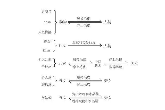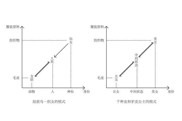 从这些童话里还可以发现了服装材料和身份存在一套严格的对应关系:穿毛皮衣服的女孩给人以丑陋的印象,地位比较卑微;穿纺织衣服的女孩给人以美丽的印象,地位也比较尊贵。将姑获鸟和织女的故事放在一起比较也可以发现同样的对应关系:毛皮对应低等的女妖,而纺织物对应高贵的仙女。从技术层面来说,加工纺织物比加工毛皮的技术含量更高,原始人是首先学会了将动物的毛皮剥下来制成衣服,后来才学会提取动植物上的纤维纺织成布料,再加工成衣服,纺织物是文明发展到较高阶段的产物。可以说兽皮代表原始和低等的层次,而纺织物代表先进和高等的层次。因而在神话故事中,纺织服装和地位尊贵、美貌的女性联系在一起,毛皮服装和地位低微、丑陋的女性联系在一起。千种皮和老人皮的故事还涉及到纺织工具和纺织行为,千种皮中的女主人公用来引导国王的三中宝物中有两种是纺织工具:小金纺轮和小金绕线车。老人皮的女主人公是在将要开始纺织时脱掉了毛皮,才被男主人公看见了真身的。著名的日本传说白鹤报恩也以一种不同的方式描绘了从毛皮到纺织服装的过渡:一个老人一次救了一只受伤的白鹤,白鹤化作少女来到老人的家里寻求报恩。她看见老人家庭贫困,于是躲进一间房间里,恢复成白鹤的身姿,并且拔下自己的羽毛纺织成精美的布料,让老人拿到集市上去卖。由于白鹤日复一日的牺牲,老人的家境逐渐殷实起来。然而故事的结尾,老人打破了不准偷看纺织过程的约定,目击到白鹤的原形,白鹤从此离开了老人。