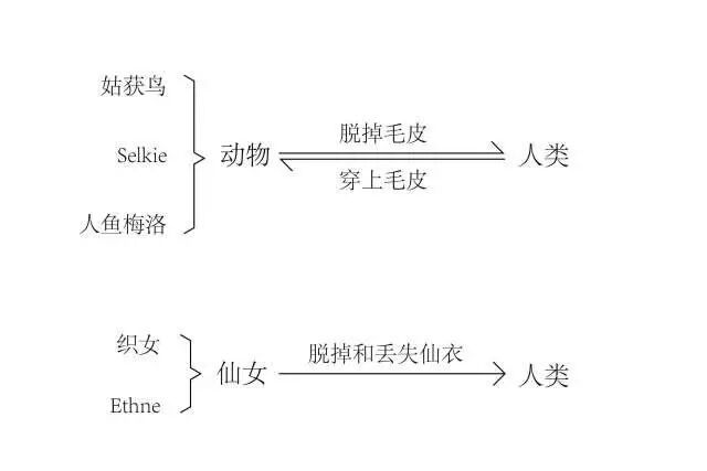 但是在接下来的故事中,她们失去了这种自主选择的权力。一个男人介入并偷走了她们的毛皮。这个行为代表着她们的自然属性遭到了强制剥夺,因而她们就再也无法返回到象征自然的异世界中去了。男人盗走毛皮的目的非常明确,是为了获得一个妻子。所以他必须先抽离他所中意的女性身上的野性,强制她从一个自然人永远转化成社会人,只有她才能进入到婚姻关系中。牛郎织女的神话和伊尼的神话是姑获鸟神话在一个文明程度更高的社会中的变奏曲。姑获鸟神话中反映出来的思想比牛郎织女的神话更加原始和淳朴。在姑获鸟神话中,男人偷走了姑获鸟的毛皮强迫她成为自己的妻子,但姑获鸟始终没有原谅男人,她用计取回了被盗走的毛皮,然后还把三个女儿一起接走了,男人用卑鄙手段得到的一切最后又全部失去了。在牛郎织女的神话中,牛郎用卑鄙的手段强占了织女,织女非但没有因此记恨牛郎,反而和他变成了一对恩爱的夫妻。表面上看似浪漫,骨子里却充满了男尊女卑的思想。在这种思想的主导下,男人以卑鄙的手段霸占女人并不可耻,反而被视为机智的行为。被剥夺权力的女人不但不能记恨男人,反过来还应当顺从男人,扮演一个温柔娴淑的妻子。之后的故事还引入了阶级观念,出身下层的牛郎与天上的仙女结合违背了社会的阶级制度,所以遭到王母娘娘的拆散。从这些意识形态来看,姑获鸟的神话产生于一个文化发展程度较低的时代或群体,而牛郎织女的故事产生于一个文化发展程度较高的时代或群体。在牛郎织女神话中,女妖变成了仙女,因为随着人类文明程度的提升,女妖逐渐被视为一种原始和低等的生物,更多的男人当然希望自己的妻子是来自天界的仙女,而不是自然界中的女妖。天界在神话中代表着一个比人类社会高级的世界,也是一个与人类社会不同的世界。因此要把天界的女性变成人类的妻子,同样需要一场身份转化的仪式,就是剥夺仙衣。仙衣被剥夺以后,仙女就由神仙降格成为一个普通的人类女性,一个屈从于男性统治下的女性。