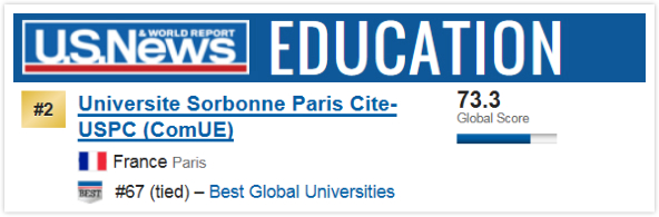在2020年US.NEWS世界大学排名中,位列世界67位,法国第二位(注:参与排名的主体为索邦巴黎西岱大学,巴黎五大和巴黎七大为其成员高校)。