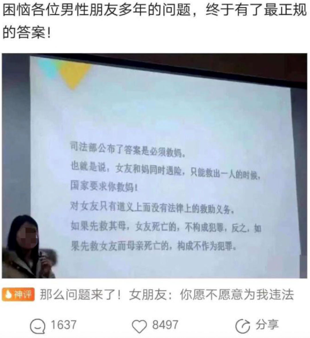 郭刚法律工作者近日网上流传一张图,说是司法部对关于“救女友还是救母亲”这个千古难题,给出了“最正规答案”:“女友和妈同时遇险,只能救出一人的时候,国家要求你救妈。如果先救妈,女友死亡的,不构成犯罪;如果先救女友,妈死亡的,构成不作为犯罪。”
