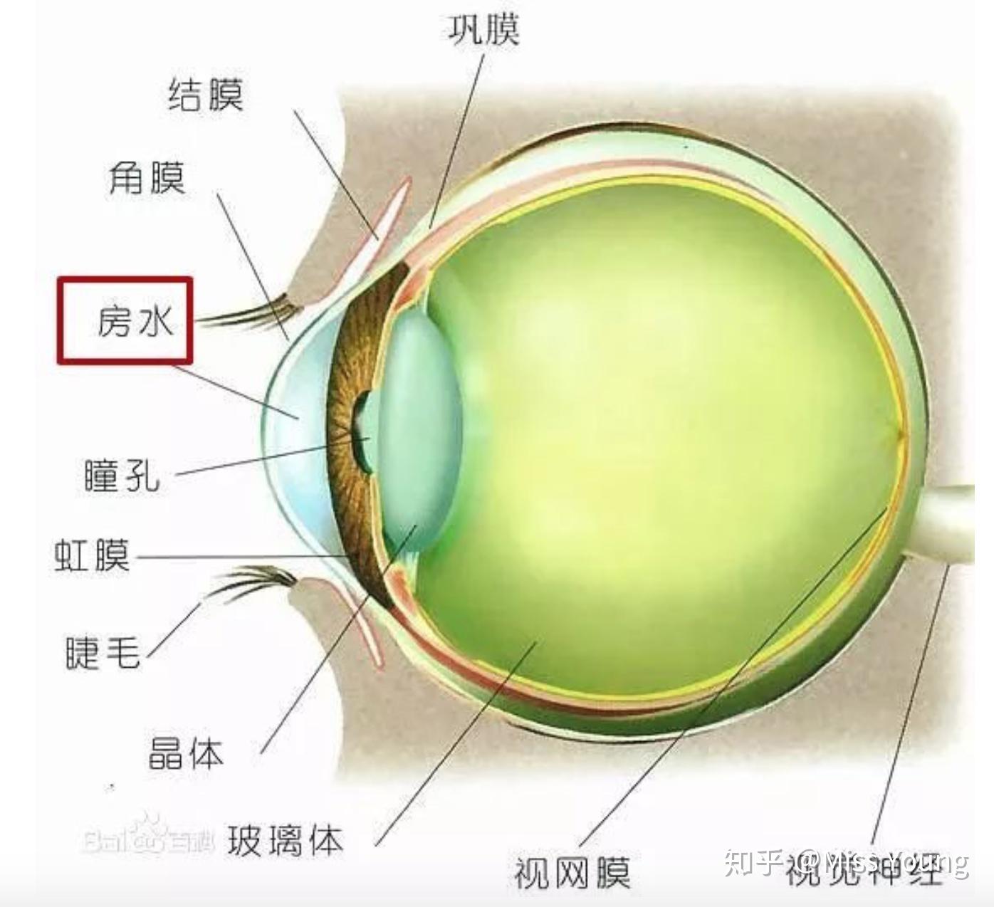 另外还有一个“房水”需要大家了解下,它是充满在角膜和虹膜之间的无色透明液体,起到维持眼压的作用(如图),相当于眼部的排水管道。