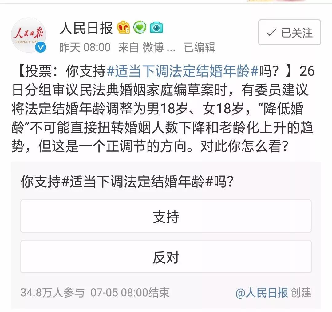 而6月26日全国人大常委会会议分组审议民法典婚姻家庭编草案时,有委员建议适当下调法定结婚年龄。