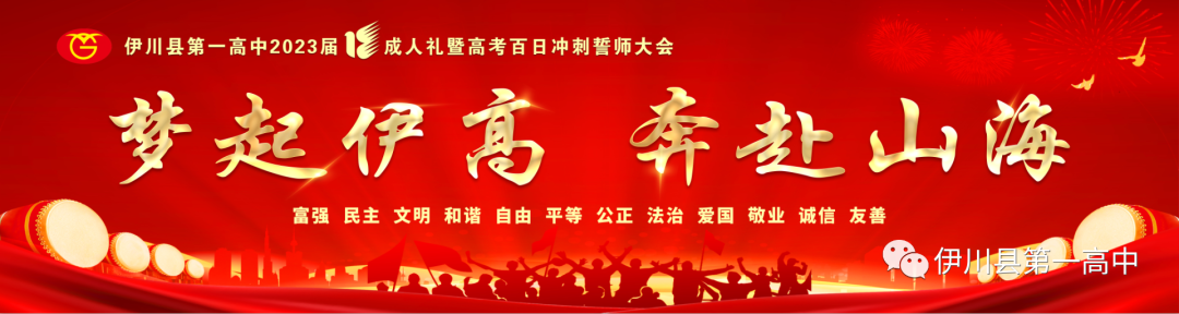 同学们,十八而志,希望你们崇德修身,用青春书写高尚人生。古有“修身、齐家、治国、平天下”的立身之本,也有“为天地立心,为生民立命,为往圣继绝学,为万事开太平”的襟怀抱负,希望你们在未来的日子里,思想永远昂扬!步伐永远坚定!内心永远滚烫!无论身处何地,都心怀一颗善良之心、是非之心、恻隐之心、正义之心,始终将道德修养置于人生发展的首要位置。无论是“兼济天下,居庙堂之高”,还是“独善其身,处江湖之远”,都要把向上、向善做为生命的底色,追求高境界的人生。同学们,十八而志,希望你们拥有智慧,用青春奠基幸福未来。同学们,剩下的100天,管理好你的人生目标,做一个全力以赴的人;管理好你的时间,做一个讲究效率的人;管理好你的学习,做一个乐学善学的人;管理好自己的未来,努力成为最好的自己,拥有对幸福的选择权。遥想7月填报志愿时,如果你考了700分以上,全国几乎所有的大学都任你选择;分数越低,选择面越窄,这就是残酷无情的现实。择业时,甚至在你选择人生伴侣时,你都在体验选择和被选择的人生际遇。成长的过程就是获取选择权的过程,而这个过程,需要你智慧清醒,拼搏进取,全力以赴。同学们,青春难再来,莫负好时光,新火试新茶,诗酒趁年华。十八而志,你们要用责任书写青春成长的每一天,用一高学子形象标准去奔赴可期的未来!做一个爱国爱党胸怀天下的公民,以躬身入局中流砥柱的姿态,投身民族复兴大业的滚滚洪流;做一个自信自强意气风发的青年,多一份独立自信与责任,多一份稳重自律与使命;做一个有礼有序善良可爱的儿女,去尊重包容懂得共情,去体恤父母尊敬长辈;做一个勤敏好学积极成长的学子,不断丰盈自我精进学业,不断追求卓越勇敢追光。亲爱的同学们,今天既是隆重盛大的成人典礼,也是伊川一高2023届高三师生决胜高考的誓师大会。高考是绝大多数人通向成功彼岸的重要途径,它将决定你今后的人生发展方向。在此我想提以下三点期望和要求:一是要锚定目标,挑战自我。在高考考场上,每一个同学都可以拥抱属于自己的成功。我们要明确树立分数意识,合理设定高考目标,激扬“不到长城非好汉”的高昂士气,坚定"蟾宫折桂,舍我其谁"的必胜信念,秉持"与考试无关的念头不要想,与考试无关的事不要做"的专注态度,以一颗火热的心投入到紧张的复习备考中去,脚踏实地,久久为功,相信高考之日就是我们的梦圆之时。二是要强身健体,平衡心态。最后100天,我们比什么时候都更接近炽热滚烫的梦想,更需要强健的体魄从容的心态来支撑我们的向往。作为临战高考的考生,我们注定会紧张辛苦,注定要负重前行,那就让我们从科学合理的饮食起居开始,从积极参与早操课间操开始,从乐享每一节体育课上的阳光与汗水开始,从晚自习课间课后呼朋引伴的夜跑开始,让自己始终保持精力充沛的高效备考状态,创造属于自己的奇迹。 三是要适应变化,提升素养。作为新老高考过渡的一届考生,我们要关注高考命题的改变,适应“无价值不入题,无情境不入题,无思维不入题"的命题导向,准确把握命题变化的趋势,提高备考的针对性和有效性。要完善构建各学科核心知识体系,提升我们的学科核心素养,在你做的一道道试题、背的一篇篇课文、写的一张张卷子中迁移提升自己分析问题,解决问题的能力。同学们,成人礼很短,人生的路很长。愿你们所有的自豪,都源自不懈的努力!愿你们珍惜青春芳华,做盛世栋梁!愿你们鲲鹏扶摇九万里,历尽千帆仍是少年!同学们,祝贺你们成年!期盼你们幸福!100天后,当你们到达自己心心念念的远方,一定不要忘记,伊川一高是你们每一个人梦想起航的地方!再次祝福你们,2023届的同学们!