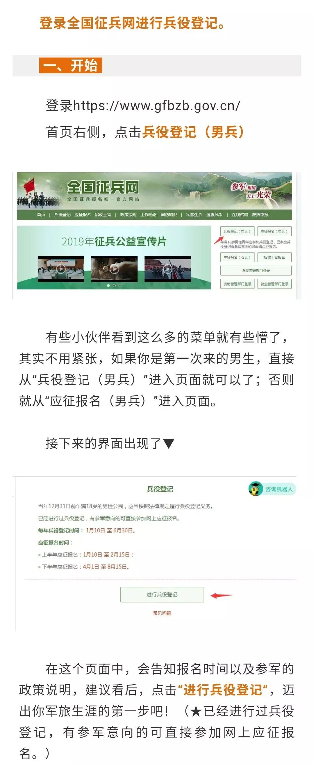 男性适龄公民登录全国征兵网(网址:www.gfbzb.gov.cn)进行网上登记。携带户口薄、居民身份证、学历证明、近期1寸免冠照片,到户口所在镇(街道)武装部进行现场确认,并领取《兵役登记证》。往年已经参加过兵役登记的男青年,应当登陆全国征兵网进行兵役登记核验。普通高校在校生可在学校所在地兵役登记站进行现场确认或核验。