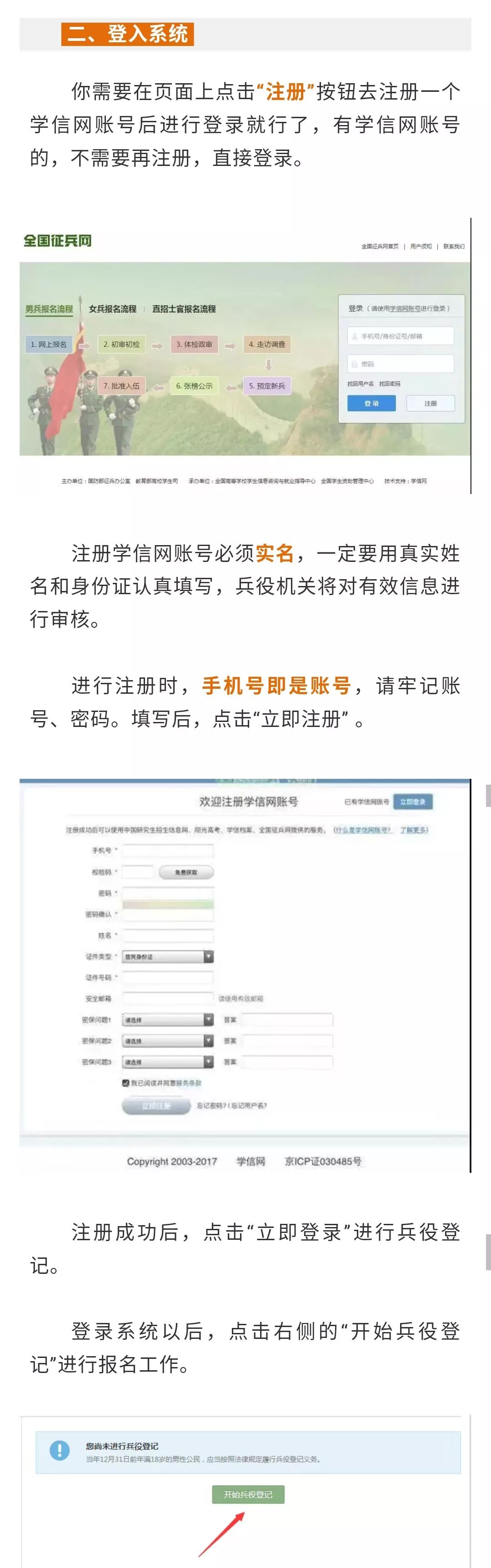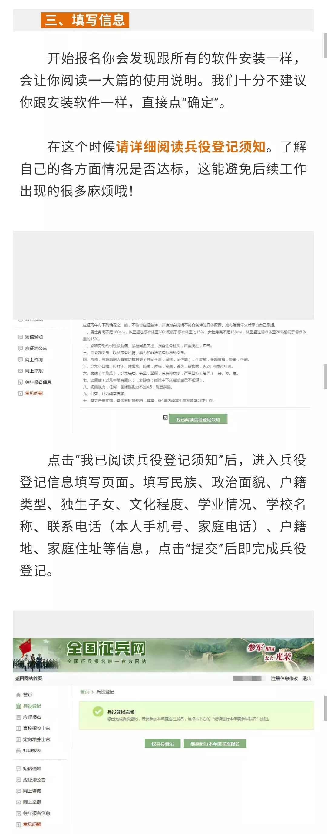 (一)网上注册信息。登陆“全国征兵网”、点击“兵役登记”选项,进行实名注册并真实、完整填写个人基本信息。