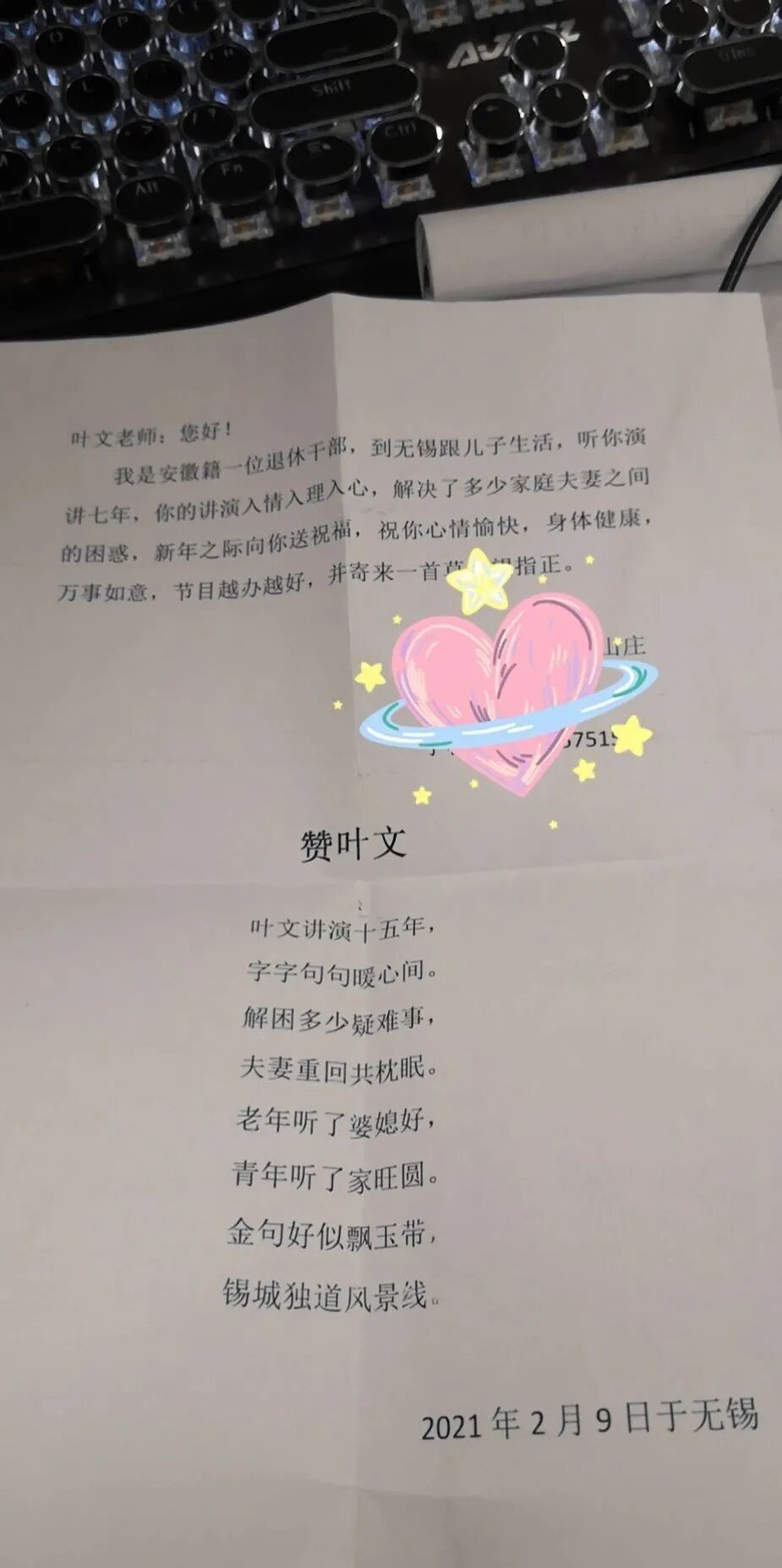听众写给叶文的信在春寒料峭、天色渐暗的汉水路街头,下班回家的叶文停下脚步,“其实我一直收到很多鼓励,我想还有更多的人是需要我们做的,所以我就做了。如果有一天这个节目不能做了,我还可以做点别的,我可以播新闻,讲故事,但那不是我最想做的。有一天如果真想放弃,我觉得我也放下了,但是一直被需要的感觉还挺……尤其我直播,看到有一些人在说’我等你直播等一天了’,心情一下子就好起来了。”说这些的时候,她的眼睛亮晶晶的。“城市上空最美的声音”被写在黑龙江广播电台4层楼道粉红色的墙面上。叶文对着手机屏幕,补涂了口红,甩着马尾走进了直播间。导播间里,赵旭已经接起了第一个电话,她把信息敲进电脑,利落地嘱咐这位听众,“记住你是一线的女士,一会叶文叫你,你就说,叶文你好,我有一个事想跟你说一下,想听听你的意见。”16点30分,导播间的收音机响起叶文的声音,“亲爱的朋友们大家好,欢迎收听今天的《叶文有话要说》”。“喂,叶文姐你好,我今年39岁,现在有个愁事,大难事,想让你帮我出出主意……”平淡又曲折的家长里短由此开始透过电波、透过屏幕,扩散开来。(应受访者要求,文中杨章、糖果、冬冬为化名)【版权声明】本文著作权归北京青年报独家所有,授权深圳市腾讯计算机系统有限公司独家享有信息网络传播权,任何第三方未经授权,不得转载。