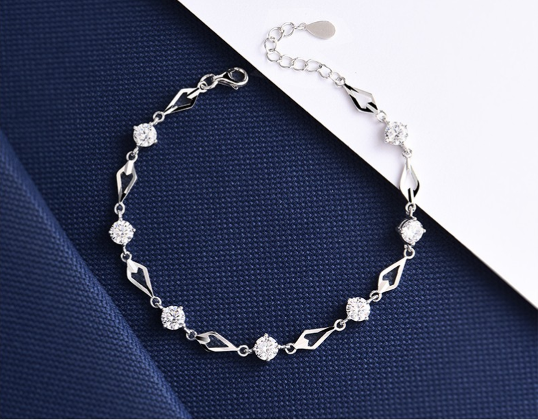 这款手链主材质为国际标准S925银,佩戴舒适不易过敏,电镀铂金光泽持久亮丽;上面镶嵌着7颗施华洛世奇锆钻,八心八箭切工,57个独立切面,多维度的折射出光芒。