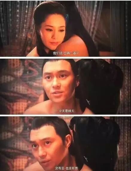 电影《白狐》中有这样一场戏,张智霖与阿娇赤裸相拥,准备翻云覆雨,然后,有了下面一番对话:“我们该云雨一番了。”“今天是晴天,没有云,也没有雨,我们该怎么云雨一番啊?”“说你傻你还真傻,你忘了,我并非凡人”,“哇,闪电啦。” ……这样的台词也是醉了,编剧的脑洞是有多大。