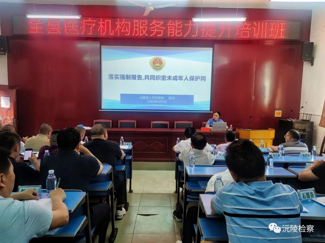 为加强未成年人全面司法保护,推进医疗机构强制报告制度落地落实,2023年6月9日,沅陵县人民检察院联合县卫健局为全县医疗机构负责人进行强制报告制度专题培训。