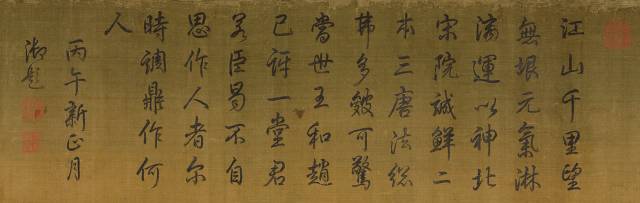 政和三年闰四月八日赐。希孟年十八岁,昔在画学为生徒,召入禁中文书库,数以画献,未甚工。上知其性可教,遂诲谕之,亲授其法,不逾半岁,乃以此图进。上嘉之,因以赐臣京,谓天下士在作之而已。