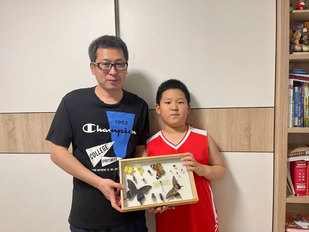 标本所用昆虫都是公园利用生态捕虫法(捕虫袋、夜间应激、以虫捕虫等方法)所残留的虫体,后期经过爸爸妈妈的反复挑选修复、整形加工、防腐处理得来的。爸爸妈妈尊重并支持殷驰皓的个人兴趣和爱好,希望通过亲密接触仔细观察,让孩子学会认真专注,学会欣赏生物,学会爱护环境。