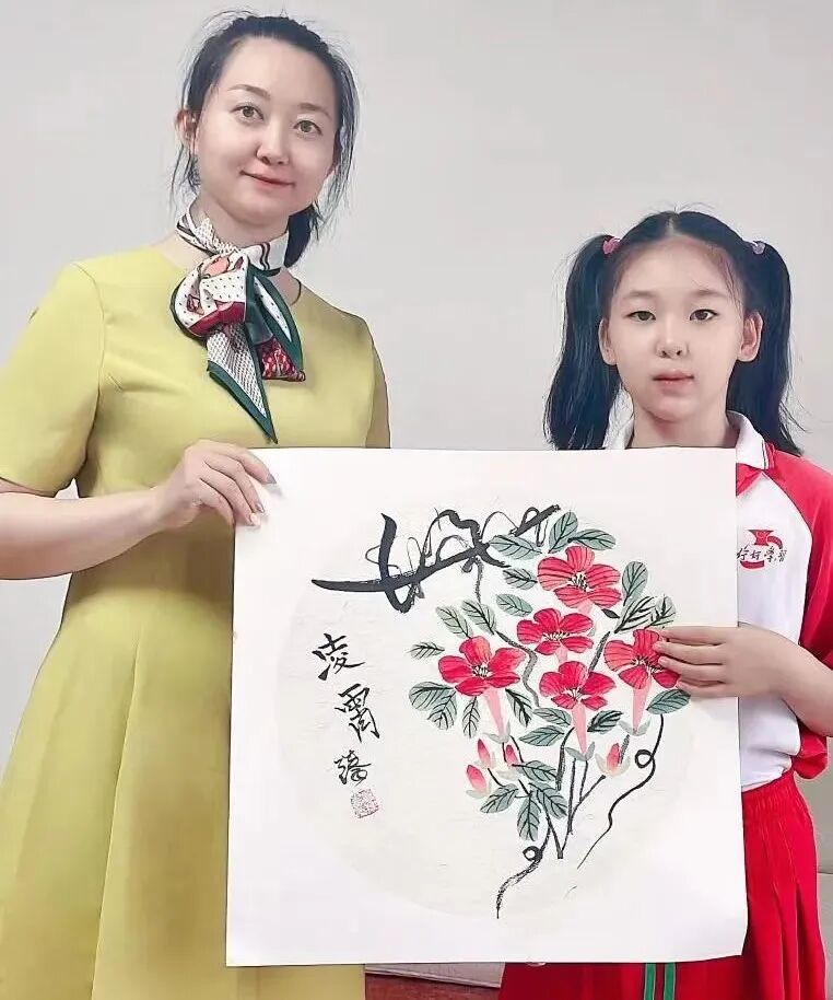 西翠校区 二年级3班 宋臻然和妈妈今年六一,我画了一幅《凌霄花》送给大女儿宋臻然。创作的初衷,一是孩子们是花园里的花朵,老师们如园丁般精心地呵护她们的成长;二是凌霄花是育英西翠校园长廊区里种植花,每每陪伴着孩子们的金秋收获时光;三是凌霄花花语是坚韧勇敢、志存高远。也是对孩子的美好祝愿。