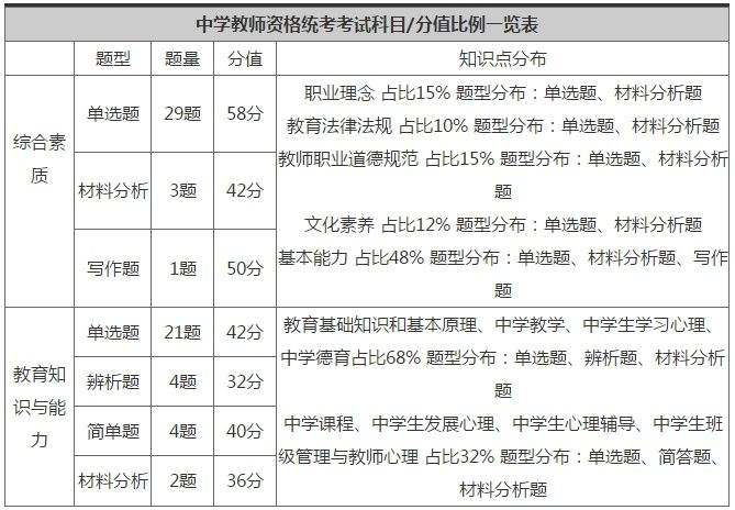 这一科相对来说还是比较容易的,但其缺点是知识点较散,不太容易把握必考点,而好处在于综合素质最后有一篇写作,难度比高考要简单一些。综合素质考试考情非常稳定,考试题型和内容每年趋于一致。小7建议将复习侧重点放在材料分析题和写作上。材料分析题集中于职业理念、职业道德和阅读理解(属于基本能力),整个材料分析题是综合素质考试当中首要的得分点,因为其考查知识点集中,考查形式稳定,非常利于复习备考 。写作分值大,占到总分的三分之一,需要考生进行重点备考。对于作文,一方面要了解作文的技巧方法,对作文有初步认识,另一方面也要勤加练习,广泛涉猎教育类文章,达到熟能生巧。