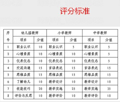 教资面试中的评分表从上表中我们可以看出,面试主要从八个方面进行评分,这八个方面具体到不同的学段中说法稍有区别,而且分值也不一样,我们来看下表:
