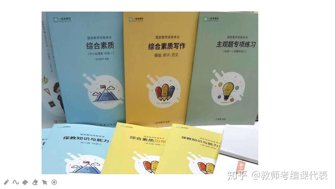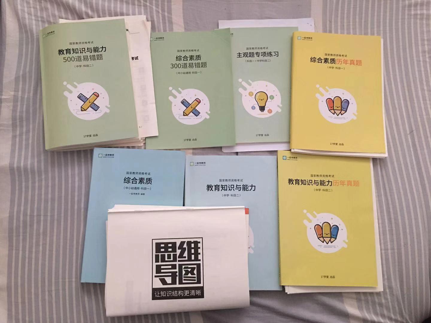 在备考教师资格证笔试的过程中,必备的纸质资料为教材和真题。自从教师资格证考试改革为国考之后,就再也没有统一教材。市面上能见到的教材都是各大教育机构依据考试大纲编写的,所以教材的质量和内容良莠不齐,考生可以选择最适合自己的教材,但是建议小可爱们一定要选择官方教材。历年真题可以帮助我们在备考过程中,了解试卷结构、考试题型、分值以及重要考点。反复2~3次往年真题,基本上就可以熟料分辨出重要知识点和易混淆知识点,掌握考试的命题趋势和规律。下图为“一起考教师”的全套教辅资料,小可爱们可以参照哦~~(颜值很高有木有O(∩_∩)O哈哈~)